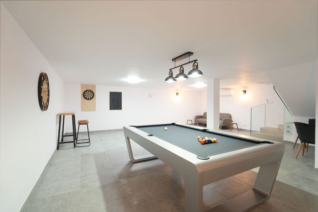 Downstairs, the spacious games room provides hours of fun, featuring a professional pool table, darts and a Bluetooth sound system. This level also houses a fully equipped laundry room with washer and dryer, ensuring a comfortable, carefree stay.
