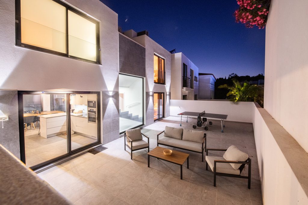 Stylishly furnished with elegant dining table, it flows seamlessly into the modern, fully equipped kitchen, complete with high-end appliances and a striking island with breakfast bar and pendant lighting. From here, doors open onto a secluded rear courtyard — a peaceful, shaded retreat (unless you play table tennis!).